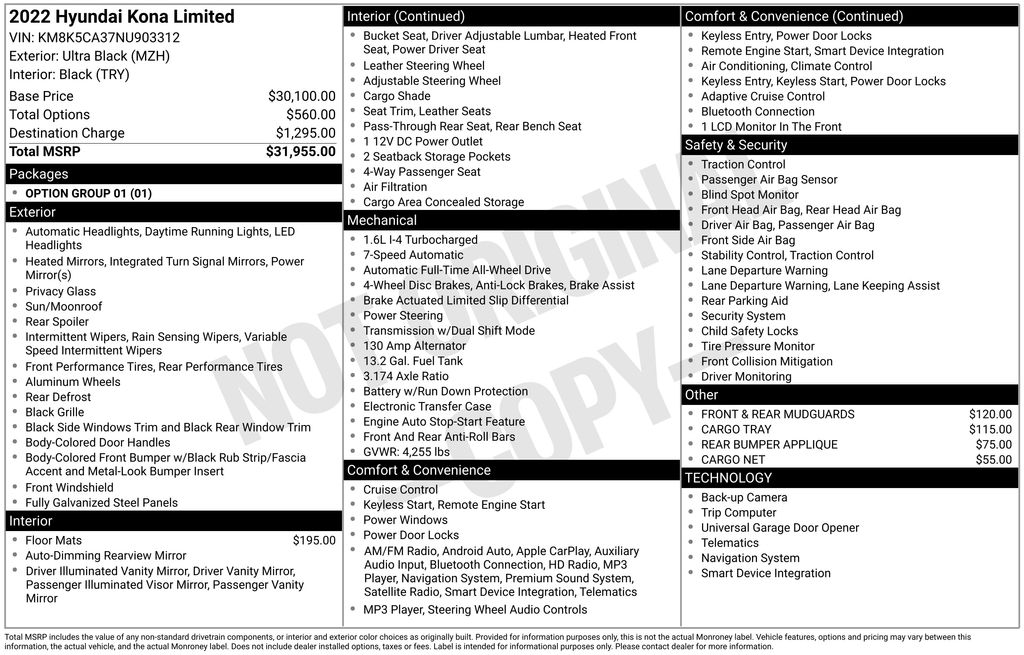 Ultra Black Pearl 2022 Hyundai Kona Limited 4D Sport Utility AWD 7-Speed Automatic 1.6L I4 DGI Turbocharged DOHC 16V LEV3-ULEV70 195hp
